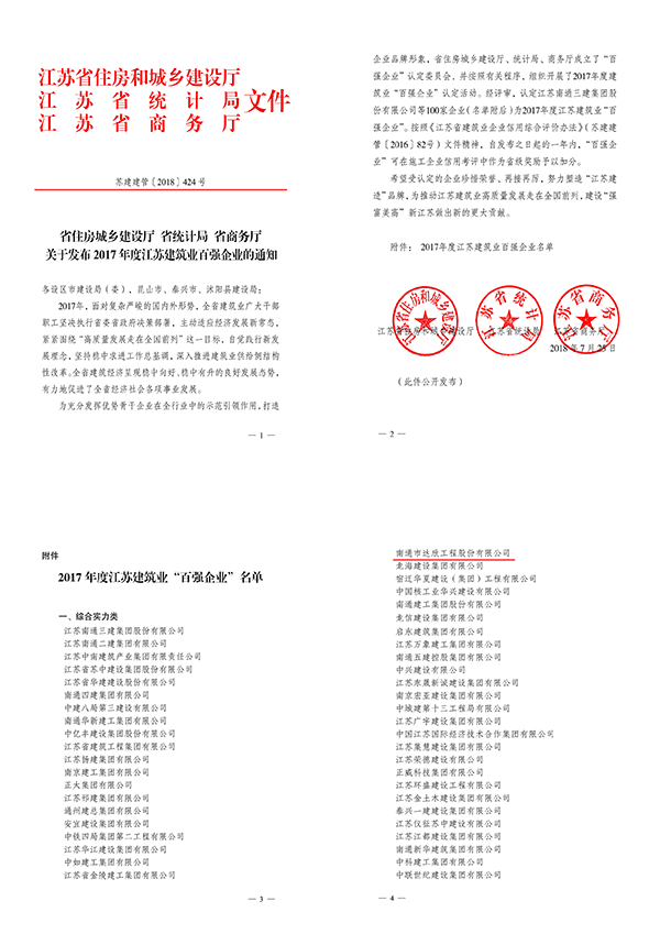 江蘇建筑業(yè)“百強(qiáng)企業(yè)”是由省建設(shè)廳、省統(tǒng)計局、省商務(wù)廳成立的“百強(qiáng)企業(yè)”認(rèn)定委員會評議認(rèn)定,從企業(yè)營業(yè)額等經(jīng)濟(jì)類指標(biāo)、質(zhì)量安全、技術(shù)創(chuàng)新指標(biāo)等方面進(jìn)行綜合評定,旨在充分發(fā)揮優(yōu)勢企業(yè)在全行業(yè)中的引領(lǐng)和示范作用,打造建筑企業(yè)品牌,提升核心競爭力,是權(quán)威性的政府評選。同時按照《江蘇省建筑業(yè)企業(yè)信用綜合評價辦法》(蘇建建管〔2016〕82號)文件精神,自發(fā)布之日起的一年內(nèi),“百強(qiáng)企業(yè)”可在施工企業(yè)信用考評中作為省級獎勵予以加分。