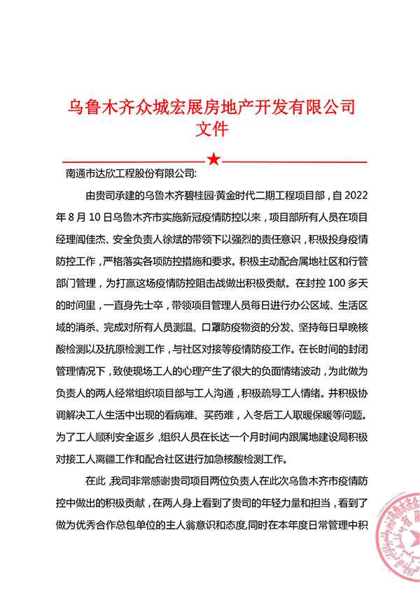1月10日,集團(tuán)公司收到來自烏魯木齊眾城宏展房地產(chǎn)開發(fā)有限公司的一封表揚信,信中對集團(tuán)第十一公司烏魯木齊碧桂園·黃金時代二期工程項目部,自2022年8月10日烏魯木齊市實施新冠疫情防控以來,項目部全體人員在疫情防控和項目建設(shè)中表現(xiàn)出的責(zé)任與擔(dān)當(dāng)表示感謝。內(nèi)容詳見附件: